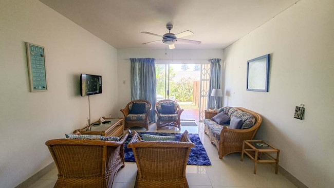 Ramsgate Palms 59 is a charming ground-floor self-catering apartment set within the secure Ramsgate Palms complex, offering a relaxed coastal escape ideal for couples, families, or friends seeking a tranquil beachside getaway. Comfortably accommodating up to four guests, the apartment features two inviting bedrooms and two bathrooms. The main bedroom includes a double bed and an en-suite bathroom with a shower, while the second bedroom is fitted with two single beds and enjoys access to a separate bathroom with a bath. The well-equipped kitchen comes complete with a stove, oven, microwave, kettle, toaster, fridge-freezer, and a convenient breakfast bar. The cosy lounge provides comfortable seating and a TV with Openview for leisurely downtime. Sliding doors lead out to a private patio with outdoor seating and serene garden views—an ideal spot to unwind. Guests can also enjoy a range of on-site amenities, including a communal swimming pool, braai facilities, a self-service laundry area, and a dedicated garage parking space for one vehicle.