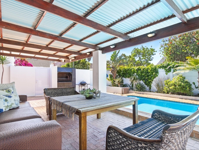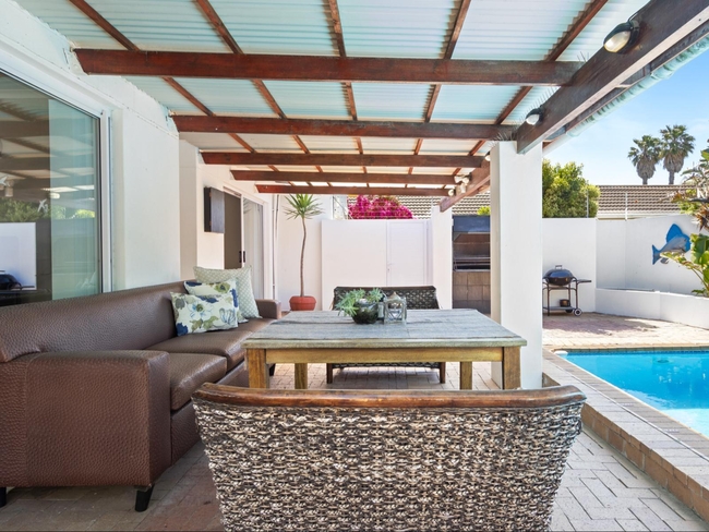 Through sliding doors, the living area opens onto a covered patio that offers an ideal setting for outdoor dining or simply enjoying the fresh coastal air. This space includes outdoor furniture, a Weber braai, and a built-in braai, catering to every al fresco dining preference. The swimming pool, surrounded by sun loungers, completes the outdoor experience, making Ravens 9A a haven of relaxation.