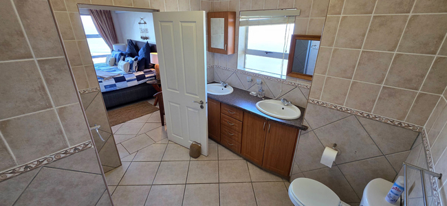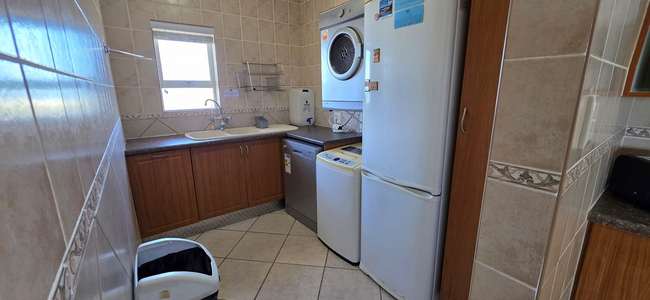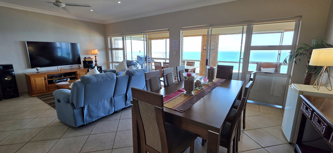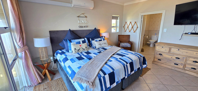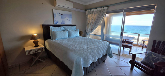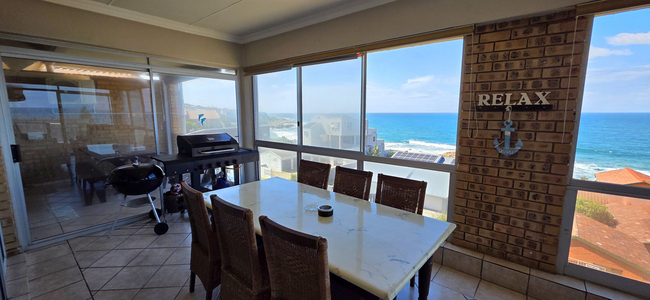 Guests have access to an enclosed balcony that offers partial ocean views, along with additional seating and a built-in braai, creating an inviting space for outdoor enjoyment.
