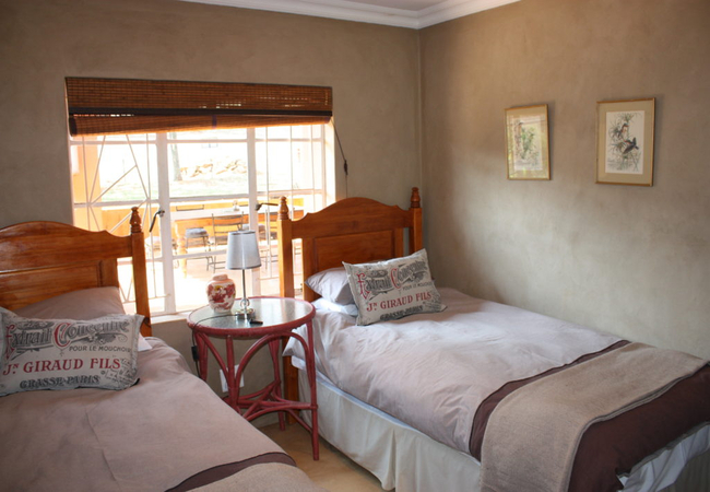 Red Barn Dairy Cottage in Dullstroom sleeps six guests in three en-suite bedrooms. The main and second bedrooms are each furnished with a queen-size bed, and the third bedroom is furnished with two single beds.