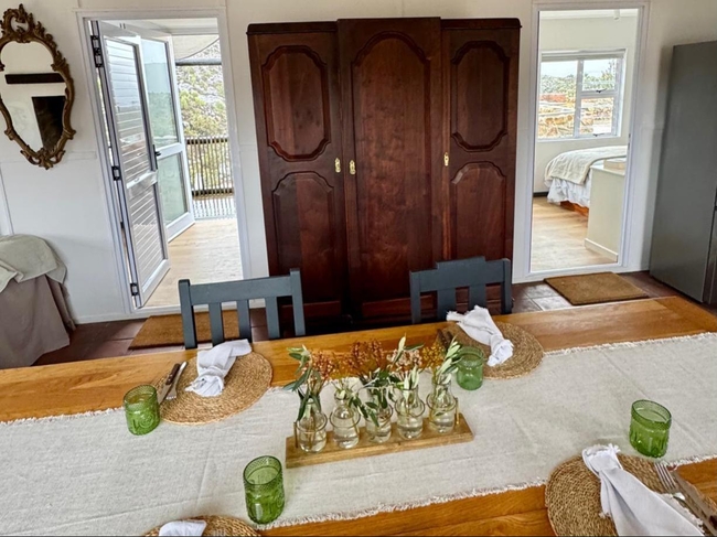 The open-plan living space includes a thoughtfully equipped kitchenette complete with a two-burner gas stove, microwave, refrigerator, kettle, and a full selection of crockery and cutlery. A central dining table allows for easy meal preparation and relaxed dining, while the adjacent lounge area offers comfortable seating, ideal for quiet conversation or a good book.