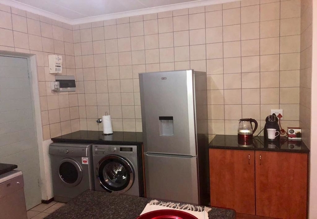 There is a fully equipped kitchen with stove, oven, fridge, microwave, washing machine, tumble dryer, electric kettle, coffee machine and cleaning products. The lounge area has comfortable furniture and a flat screen TV with DStv.