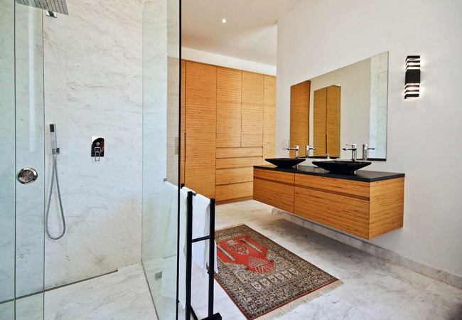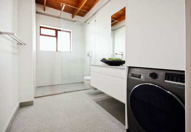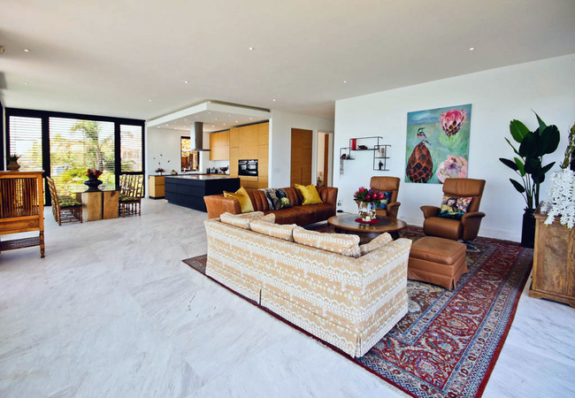 Baywatch's Apartment is a third-floor suite with three en-suite bedrooms with two Queen and one King-size bed. It also has a guest's toilet. The suite has an open plan kitchen, a lounge and dining area. The lounge area has large sofas and adjustable lounge chairs. The kitchen is fully equipped with a dishwasher, fridge and deep freeze. There is a large kitchen island, microwave and coffee / espresso machine. Guests also have access to washing machine and tumble dryer. The dining area opens to a balcony that has a breath-taking view of the ocean.