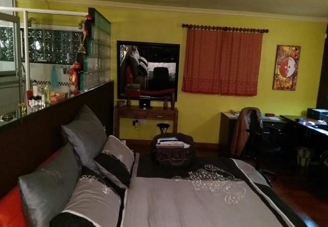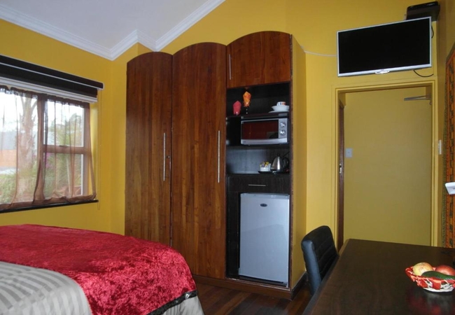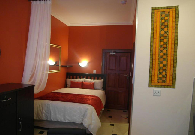 A spacious and generous room with 3 metre high ceilings, beautiful modern warm colour scheme, rosewood floor. It is equipped with an extra-large king-size bed, DSTV TV, desk, fridge, tea/coffee bar, microwave, rosewood wardrobe and other amenities.