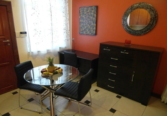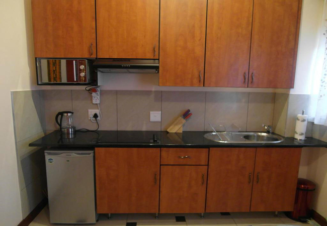 A fully contained one room flat, with a fully equipped kitchen with stove, microwave, fridge and a dining table. It is in a modern colour scheme with ceramic tile floor. It is equipped a queen size bed, DSTV TV, desk, a nice bathroom and amenities
