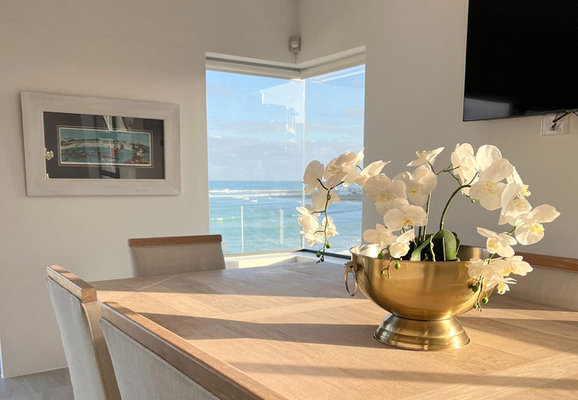 The large open-plan kitchen is equipped with a stove, microwave, fridge, washing machine, dryer, tea and coffee facilities and meals can be enjoyed at the breakfast bar or dining table, enjoying the views. The living area offers comfortable seating with a TV with DStv, and overlooks the ocean.