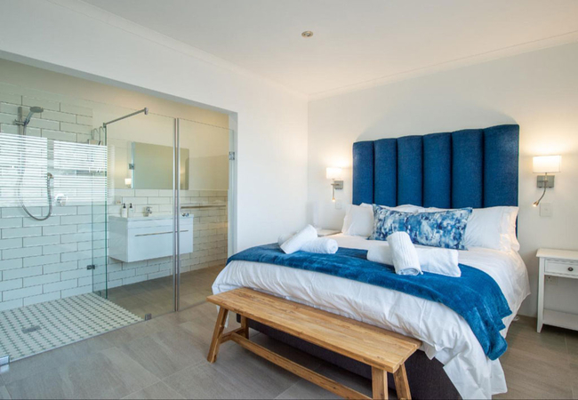 RegSuid has two en-suite bedrooms furnished with Queen-size beds. The en-suite bathrooms are fitted with a shower, toilet and basin. The large open-plan kitchen is equipped with a stove, microwave, fridge, washing machine, dryer, tea and coffee facilities and meals can be enjoyed at the breakfast bar or dining table, enjoying the views. The living area offers comfortable seating with a TV with DStv, and overlooks the ocean. Guests have use of private outdoor braai facilities. The apartment has solar power, offers uncapped Wi-Fi access and off-street parking is available.