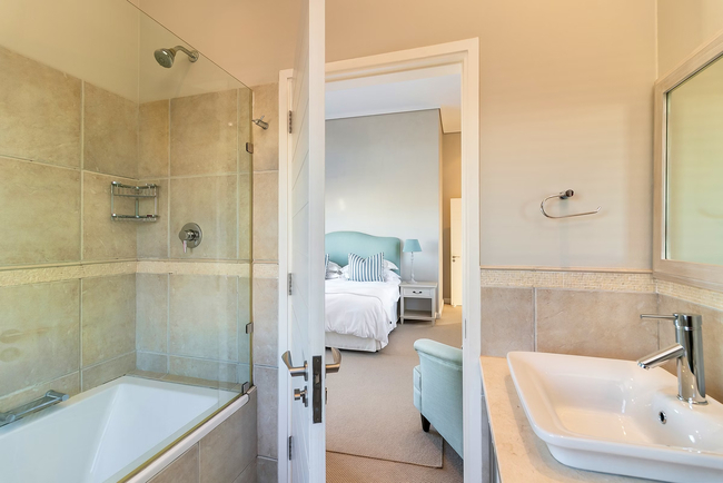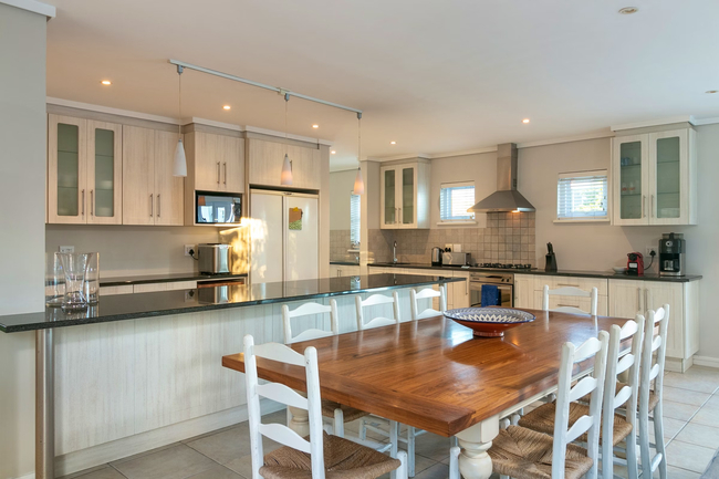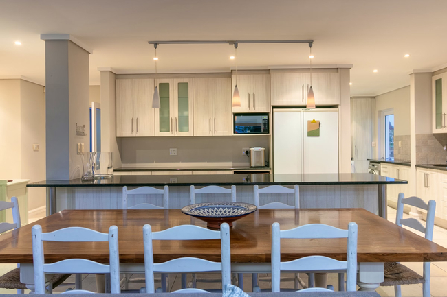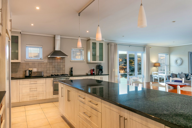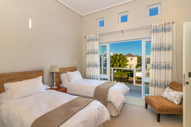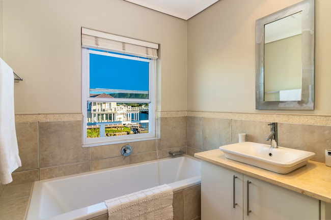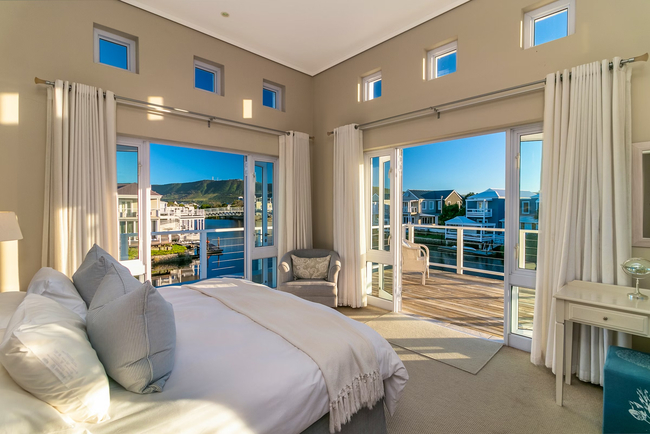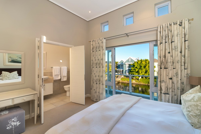 This beautiful waterside home features 4 en-suite bedrooms and comfortably accommodates up to 8 guests. The main bedroom is equipped with a king-size bed and an en-suite bathroom that includes a bath, shower, basin, and toilet. Two of the other bedrooms each have queen-size beds and en-suite bathrooms with showers. The fourth bedroom is furnished with twin beds and has its own en-suite bathroom with a shower. All the bedrooms open onto either a balcony or patio, offering lovely views of the surrounding canals. The home's open-plan layout includes a fully equipped kitchen with modern appliances such as a gas stove, electric oven, fridge-freezer, and all necessary cutlery and crockery. A laundry area is also available for guests' convenience. The spacious lounge is fitted with plush seating and a TV with full DStv access, perfect for relaxation after a day of exploring. The living space extends outdoors through multiple doors, providing uninterrupted views of the water. A large braai area, complete with an 8-seater dining table, makes for a perfect spot for al fresco dining. Guests have direct access to the canal via the patio and private jetty. The estate is also secured with 24-hour security.