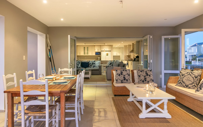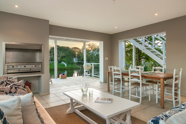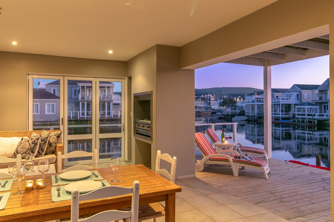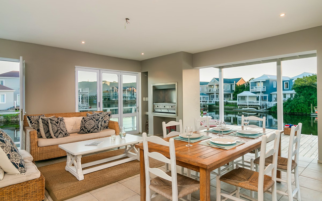 The living space extends outdoors through multiple doors, providing uninterrupted views of the water. A large braai area, complete with an 8-seater dining table, makes for a perfect spot for al fresco dining. Guests have direct access to the canal via the patio and private jetty. The estate is also secured with 24-hour security.