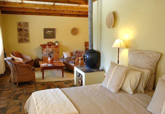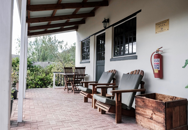 This Double Room with Mountain View is situated in the converted weaving shed. The room is furnished with a King-size (or twin) bed. The en-suite bathroom is equipped with a hand basin, toilet and shower. There is a sitting areas with fireplace and the verandah has magnificent views of the Swartberg mountains.