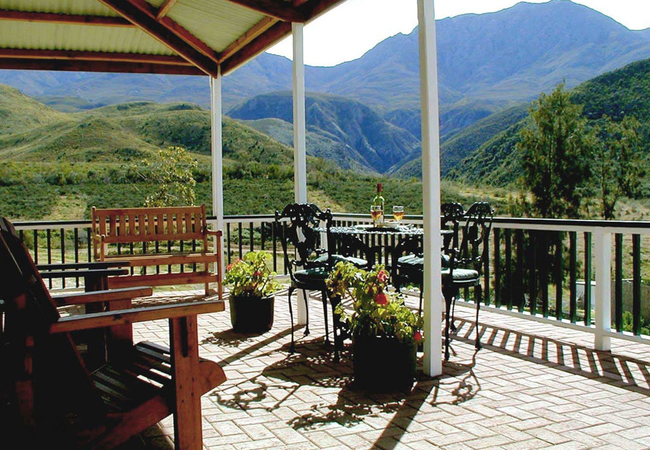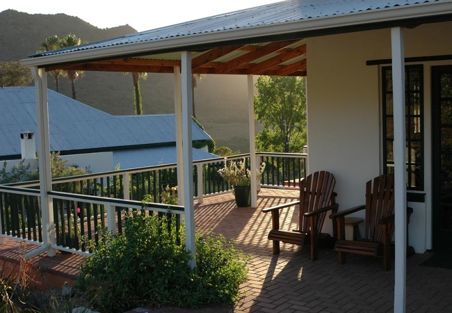 The house, filled with yellow-wood and mellow Oregon pine, has a lounge and dining room - each with its own ceramic fireplace to keep them cosy on chilly winter evenings - leading onto a wide verandah, overlooking the sweeping gardens and majestic Swartberg mountains.