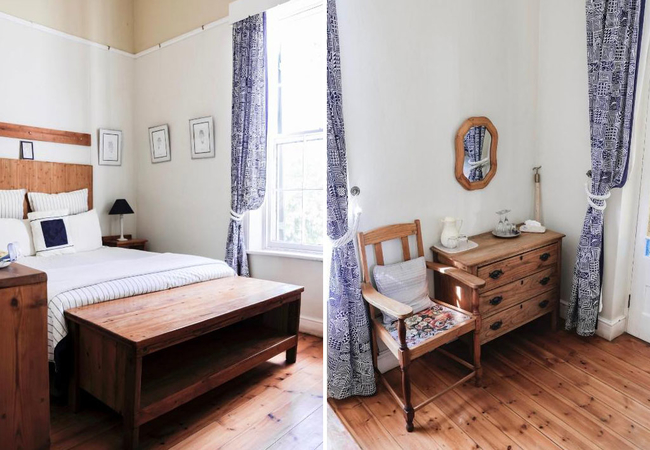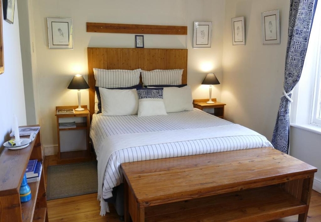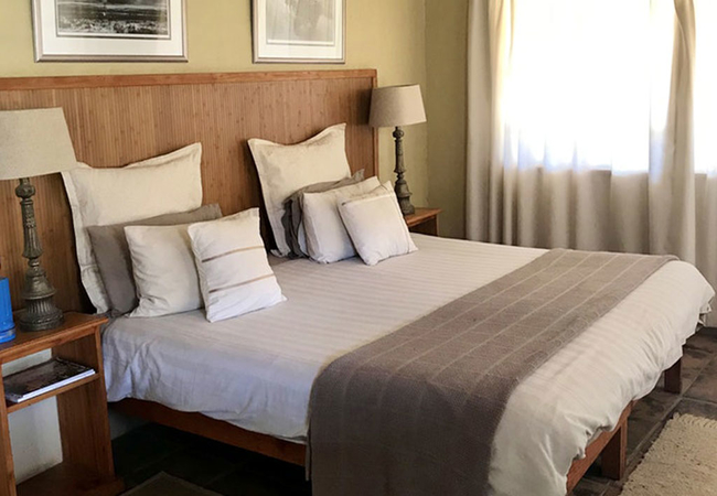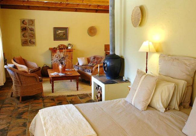 The Triple Room with Mountain View is situated in the converted weaving shed. The unit is furnished with a King-size (or twin) bed. The en-suite bathroom is equipped with a Victorian bath and shower. There is a comfortable sitting area with fireplace. The unit also has a small study / alcove room which is furnished with a third single bed, suitable for one additional guest. This unit has a verandah with magnificent views of Swartberg mountains.