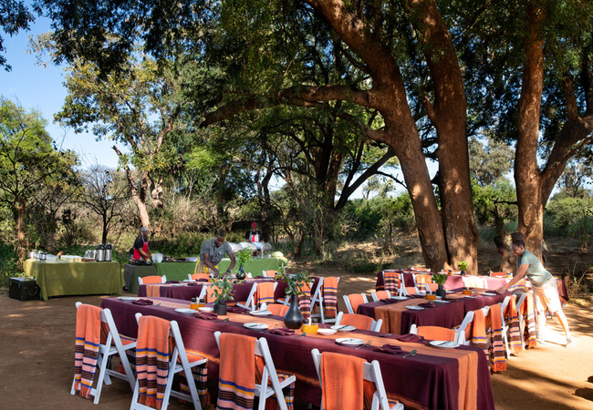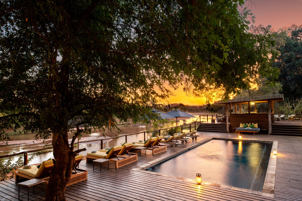 The communal area at Pafuri offers al-fresco dining, a bush bar, a swimming pool and plenty of space to laze about in the shade of the giant trees that overhang the camp. Breakfast, high tea and dinner are served on decks above the river.
