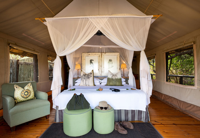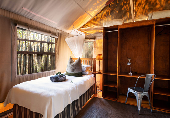All tented rooms are located along the banks of the Luvuvhu River offering sweeping views from the private balcony. Each open plan designer room is equipped with a mosquito net, outdoor shower, fan, safe, sitting area, tea/coffee making facilities and king sized extra length bed. The family units have an extra bedroom inter-leading to the main bedroom.