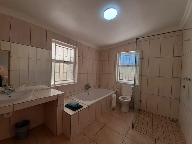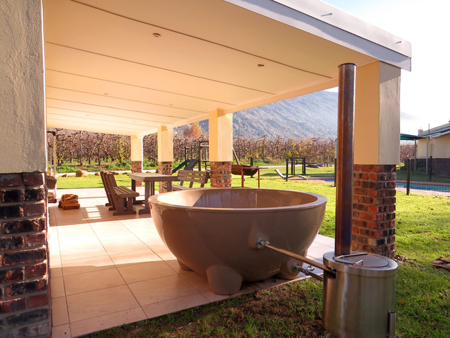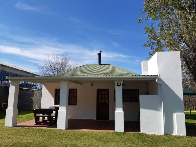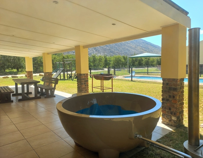 Voëlvlei Cottage No. 5 is a contemporary and generously sized three-bedroom retreat, perfectly suited for families or groups of up to seven guests. The main bedroom features a king-size bed, the second bedroom is furnished with three single beds, and the third includes two single beds. Flexible sleeping arrangements can be arranged upon request. The cottage includes two bathrooms: an en-suite with a bath, shower, toilet, and basin, as well as a second bathroom fitted with a shower, toilet, and basin. The open-plan living area combines a comfortable lounge, a well-equipped kitchen, and an indoor braai with fireplace. Large sliding doors lead out to a spacious covered stoep, which overlooks the communal swimming pool and jungle gym play area. A private wood-fired hot tub, located on the stoep, offers panoramic views of the Skurweberg Mountains and surrounding orchards, ideal for a relaxing soak under the stars. Use of the hot tub requires pre-booking and carries an additional charge on weekends. Added conveniences include underfloor heating, a dishwasher, and shaded parking to ensure a pleasant and comfortable stay.