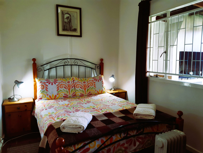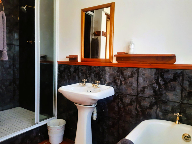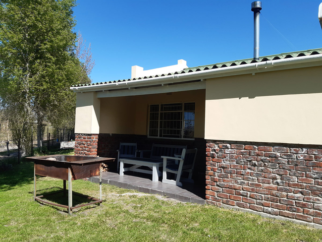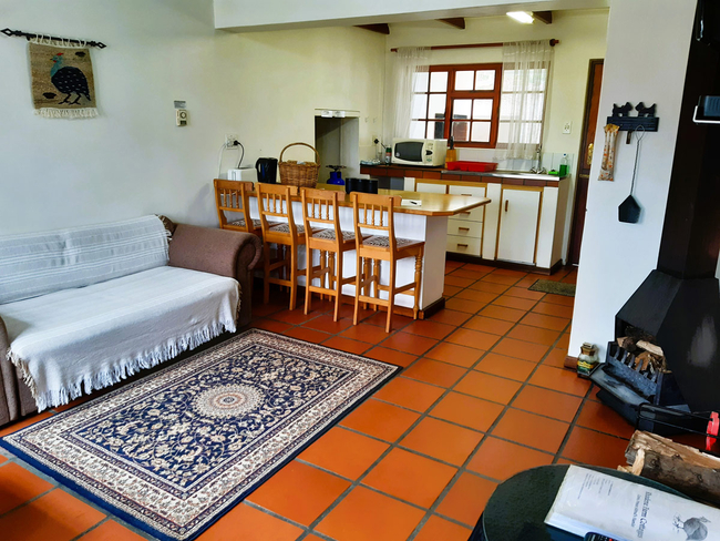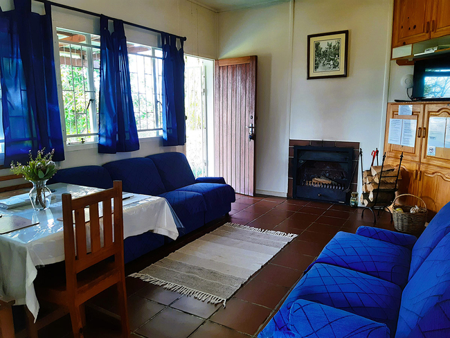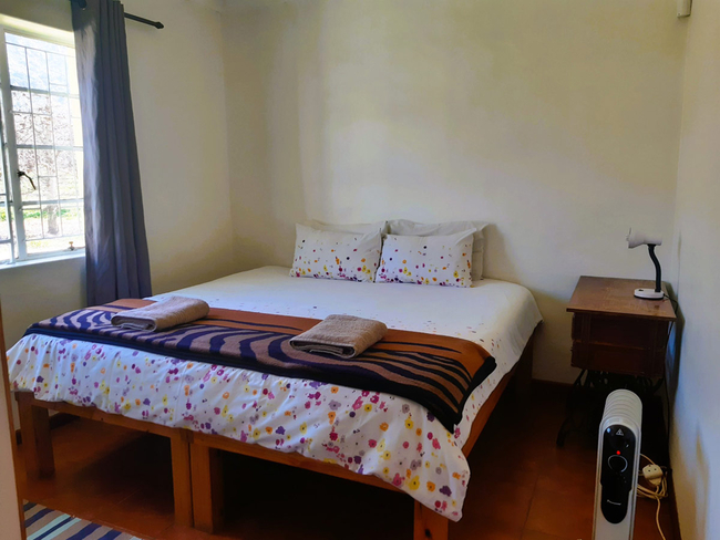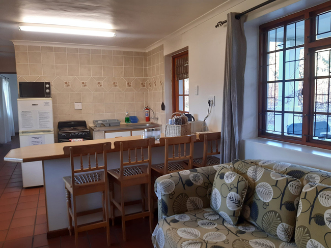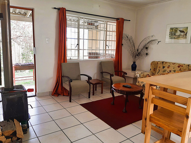 Guinea Fowl Cottage provides comfortable accommodation ideal for two adults. The bedroom is tastefully furnished with a double antique brass bed, evoking a sense of classic charm. A separate bathroom is available, equipped with a bath, shower, and basin, while an additional toilet adds convenience. The open-plan kitchen and lounge create a welcoming space for relaxation, complete with a fireplace and underfloor heating to ensure warmth during the colder months. A roof-covered stoep with a built-in braai enhances the living experience, offering a pleasant spot for outdoor dining. Shaded parking is provided for added peace of mind.
