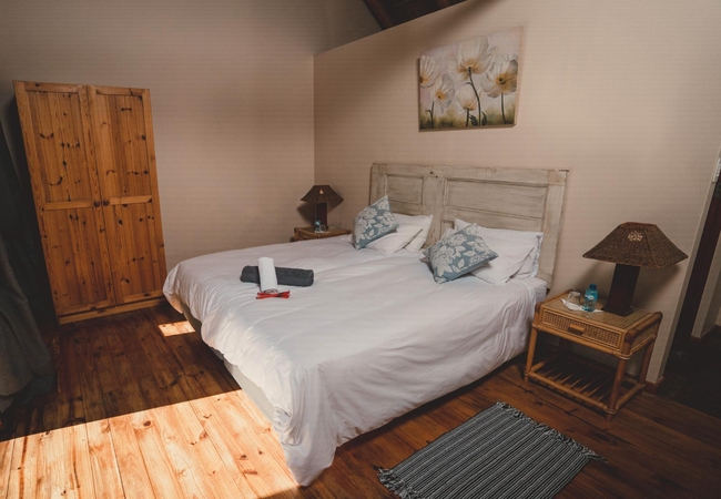 Ribbok Chalet at Oudebosch is a lovely two bedroomed chalet in Riversdale sleeping four guests. There are two bedrooms, the first room is furnished with one double bed and the second room is furnished with two single beds. Each room has a private en-suite bathroom fitted with a shower, toilet and basin. The kitchen is fully equipped and includes a stove, oven, microwave, tea / coffee making facilities, toaster, a fridge / freezer and a four seater dining area where guests can enjoy their meals. The living area is furnished with comfortable furniture and an indoor fireplace. The living area flows out onto an undercover patio with braai facilities to enjoy those perfect African sunsets while watching our wildlife graze on your doorstep.