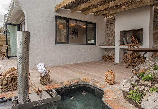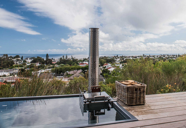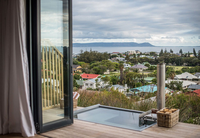 The Aloe Suite is the perfect hideaway for a luxurious romantic getaway in Hermanus and is furnished with a King-size bed, a sofa bed for a child and an en-suite bathroom fitted with a bath, shower, toilet and basin. This chic 70sqm suite has a private kol-kol wood-fired hot tub on its sea facing deck. The full length stack-away doors provide a spectacular view over Hermanus. The open plan room has a cosy lounge with log fireplace and a self-catering kitchenette. An outside braai/barbecue area with mountain views offers a sheltered spot to braai and relax.