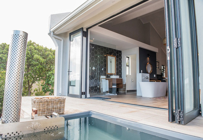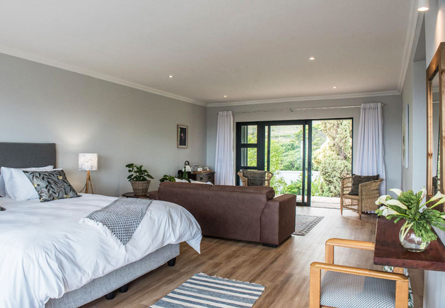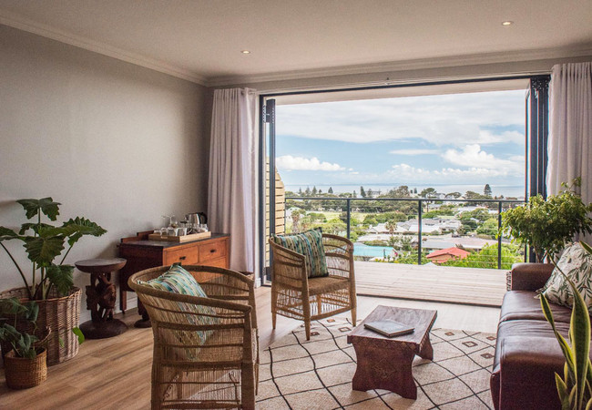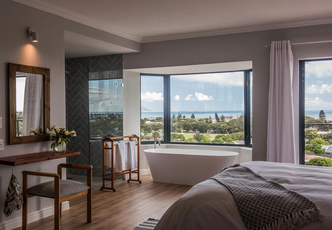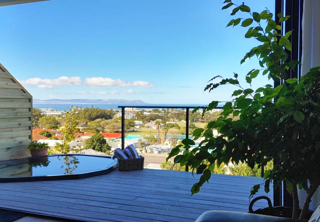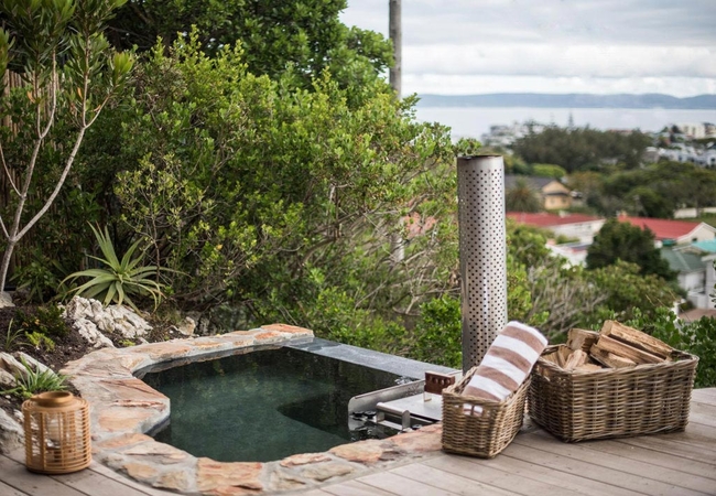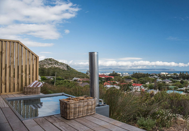 Botanical Suite is a tastefully decorated room brimming with beautiful plants and is furnished with a King-size bed or twin beds if preferred and an en-suite bathroom fitted with a shower, toilet and basin. There is a kol-kol wood fired hot tub on its private deck with gorgeous sea views. Huge glass doors lead onto the deck from the suite giving you a beautiful view over Hermanus and to the bay beyond from its plush leather lounge suite. A lovely entrance patio opens onto the garden and has beautiful mountain and fynbos views.
