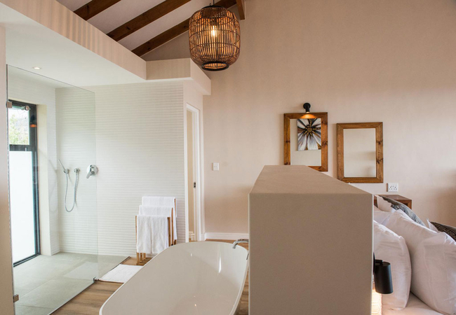 Rockpool Suite is furnished with a King-size bed, a sofa bed for a child and an en-suite bathroom fitted with a bath, shower, toilet and basin. It has a kol-kol wood-fired hot tub nestled into the rock and indigenous bush. The large wrap around deck has beautiful views and a covered braai/barbecue area with outdoor seating, surrounded by nature. This 60sqm room has a cosy pot belly fireplace and self-catering kitchenette.