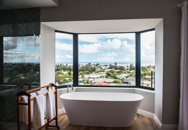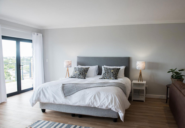 This beautifully appointed suite is both peaceful and luxurious, and is furnished with a King-size bed and an en-suite bathroom fitted with a bath, shower, toilet and basin. Soak in the view of Hermanus and Walker Bay from your bay window bath, or your private sea-facing sundowner deck. The entrance patio has a gorgeous mountain view, is sheltered from the wind and creates a lovely north-facing, sunny patio for a winter afternoon. The Bay Suite has direct access to the garden and communal braai/BBQ area.