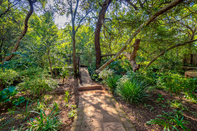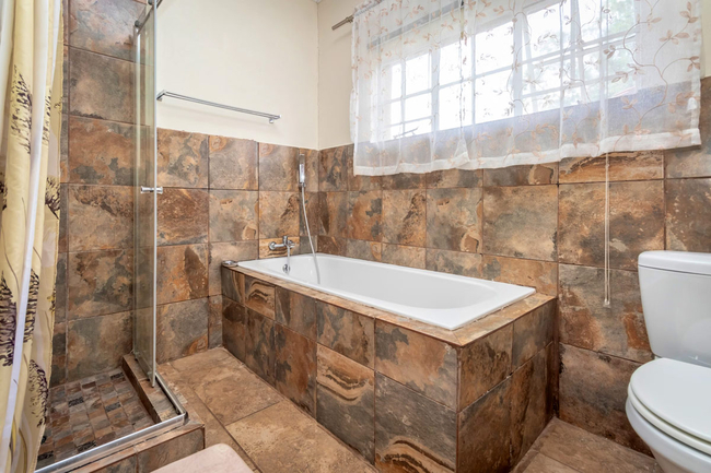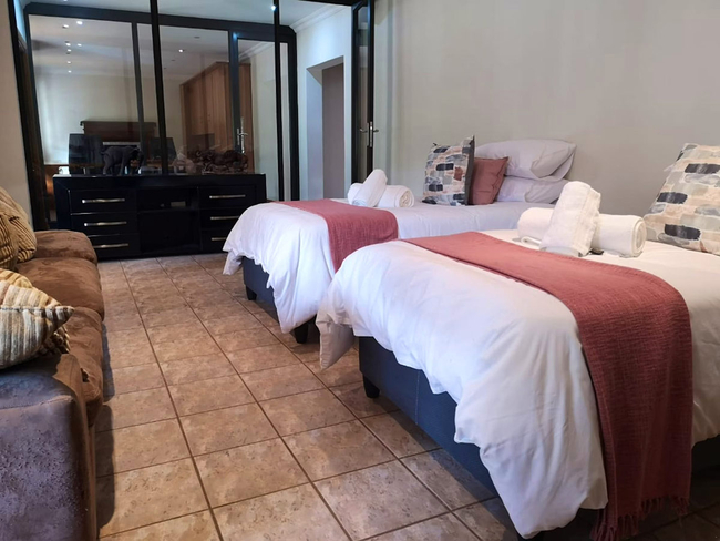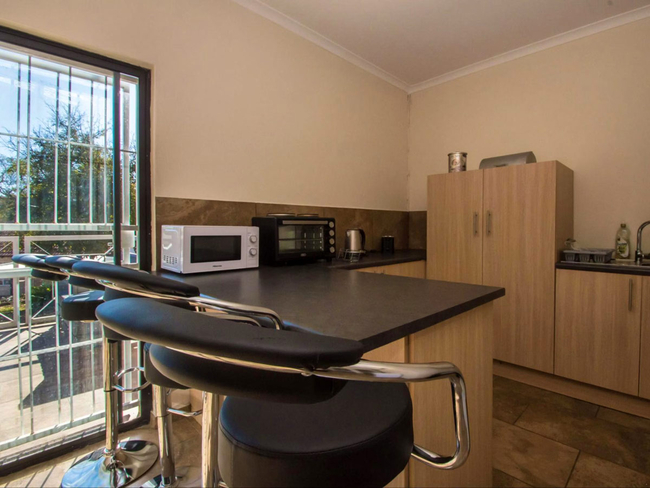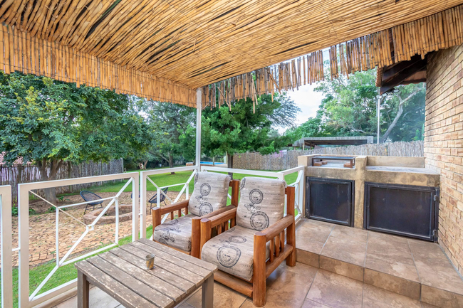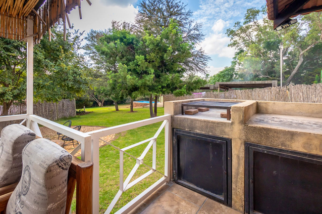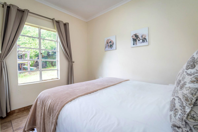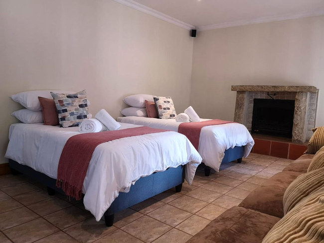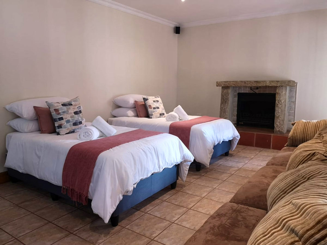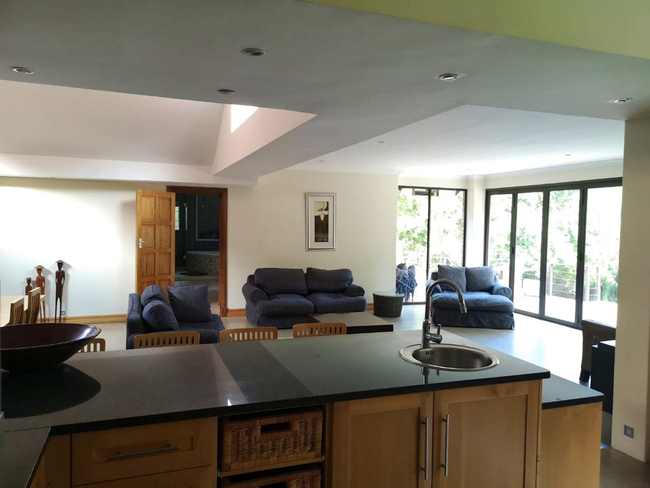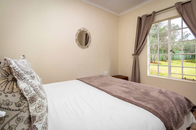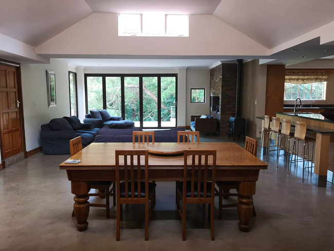 The house offers six thoughtfully arranged rooms, providing comfortable accommodation for up to fourteen guests. Four of the bedrooms are appointed with double beds, while the remaining rooms are furnished with single beds to suit various group configurations. Several of the rooms benefit from private en-suite bathrooms, equipped with either a bath or a shower, while the rest of the guests share access to a separate bathroom fitted exclusively with a shower. An open-plan layout defines the living area, where guests can relax in the inviting lounge space or prepare meals with ease in the fully equipped kitchen. The kitchen includes a fridge-freezer, stove, oven, microwave, and facilities for making tea and coffee, ensuring convenience throughout your stay. Beyond the interior, the house extends onto a covered patio overlooking a large, well-kept garden—a peaceful setting ideal for appreciating the natural surroundings. Guests are welcome to enjoy the splash pool on warmer days, make use of the braai facilities for relaxed outdoor dining, or simply unwind while absorbing the calm and scenic atmosphere.