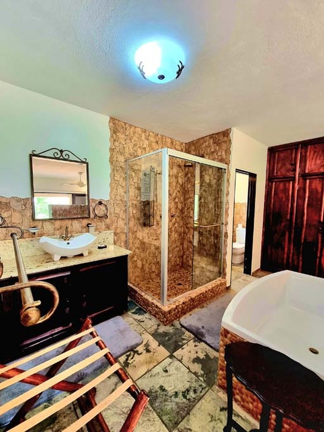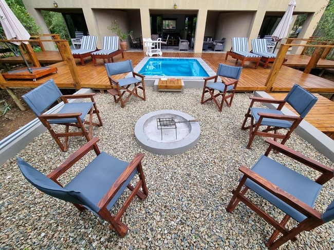 The River Dance provides a luxurious retreat for up to 8 guests, in 4 en-suite bedrooms furnished with king-size beds. Each bathroom is equipped with both a bath and a shower, and guests enjoy quality linen and bath towels. Sliding doors lead to a charming patio with braai facilities, outdoor furniture, and a private swimming pool, perfect for relaxing in a tranquil environment. Complimentary Wi-Fi is available for guests needing connectivity during their stay. Outside, the patio has a built-in braai. There is also a firepit and a swimming pool with a safety net.