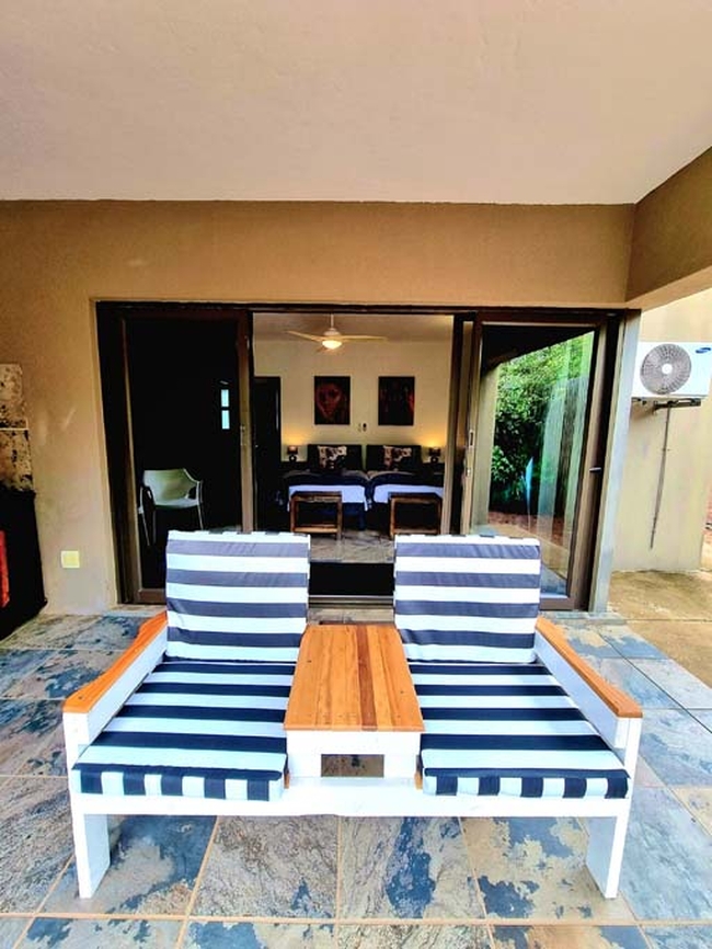 Sliding doors lead to a charming patio with braai facilities, outdoor furniture, and a private swimming pool, perfect for relaxing in a tranquil environment.