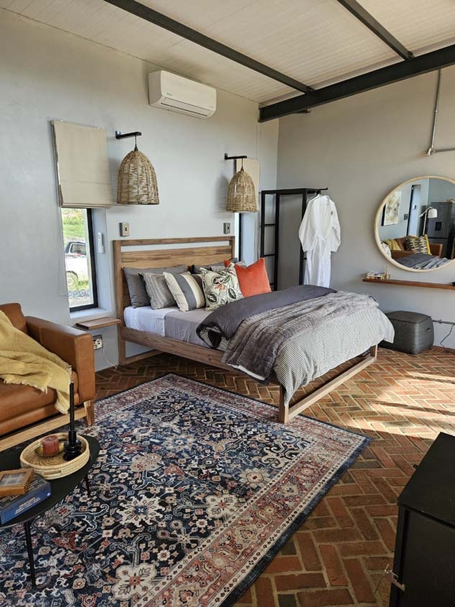 The interior has been given a contemporary kick with a palette of neutrals peppered with bright colored soft furnishings. The swanky sundecks with sunken Jacuzzis and open fireplaces make this the best sundowner spots on the Breede River!!