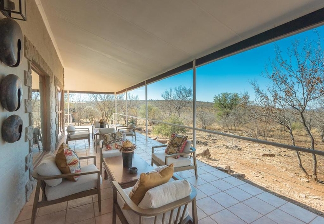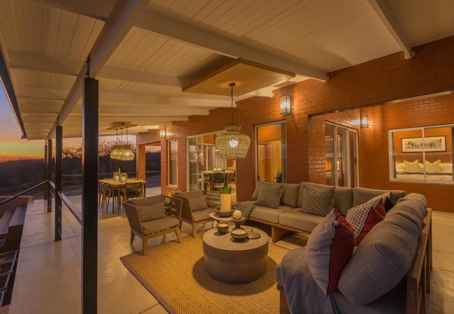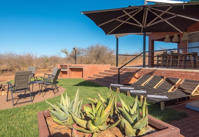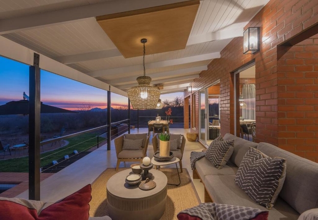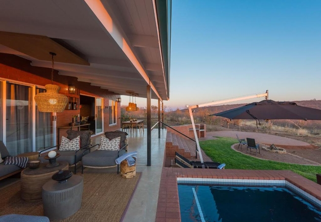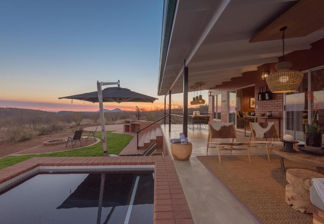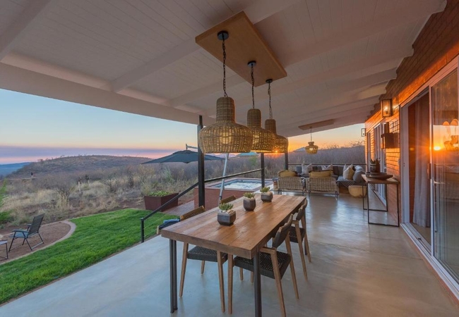 A luxurious modern villa has three bedrooms each with a bathroom en-suite. It is fully equipped for self catering and boasts with breathtaking views over the hills of Madikwe. The villa has a private boma, pool and spacious patio.