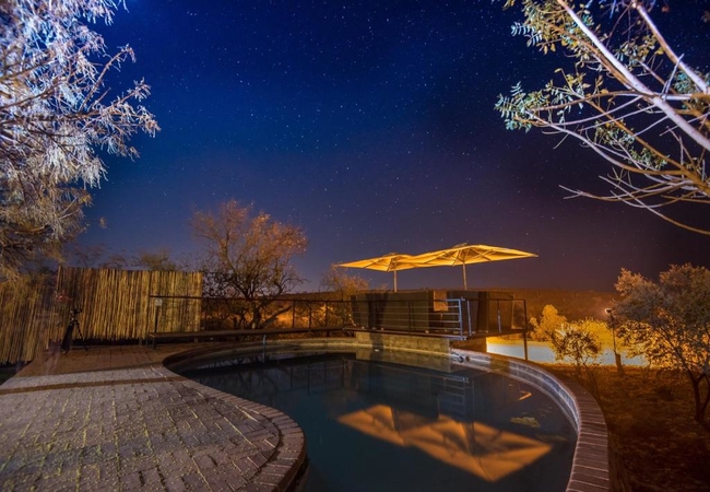 Double Luxury Villa sleeps four guests. Tlou suite has two beautiful bedrooms, each with king size beds and en-suite bathrooms. The unit boasts everything needed for a comfortable and relaxing stay. Each room has an its own outside shower which brings you even closer to nature while maintaining privacy. Tlou means elephant in Setswana and you can expect to spot them drinking from the watering hole at the underground hide which is within walking distance from your suite. You can spend your day lounging around your private splash pool which overlooks the bushveld or dozing off to while listening to the beautiful sounds of indigenous birds. The unit offers an intimate lounge with an open plan design and large glass sliding doors onto a balcony which opens up to magnificent views. An open boma fire can be lit in the evenings where you can sit around in style and enjoy a sundowner while looking up at the stars in the clear night sky.