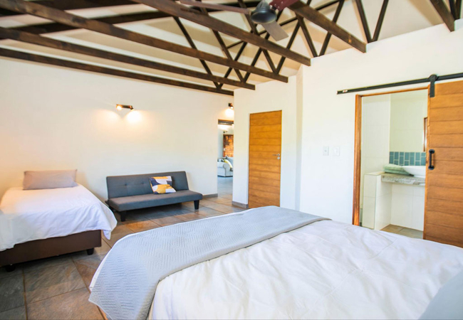 Rock House has two bedrooms furnished with Queen-size beds and a sleeper couch. The rooms both have an en-suite bathroom fitted with a shower, toilet and basin. The kitchen is fully equipped for self-catering including a gas hob. The open plan living area has a dining table and a comfortable lounge with a smart TV. Stacking doors lead outside onto the covered patio with outdoor seating, braai facilities and a hot tub. Guests can enjoy scenic dam views.
