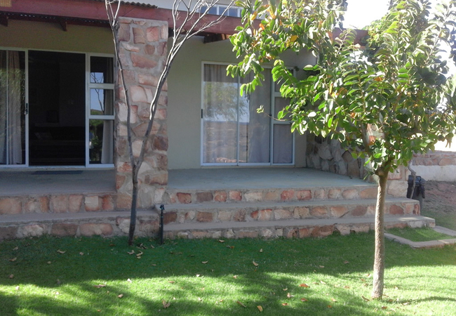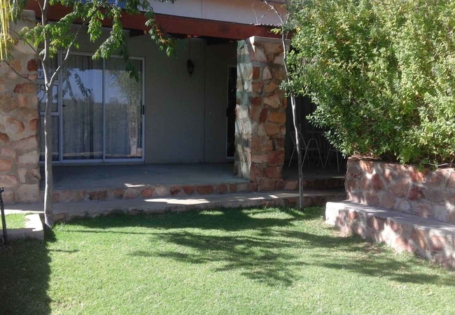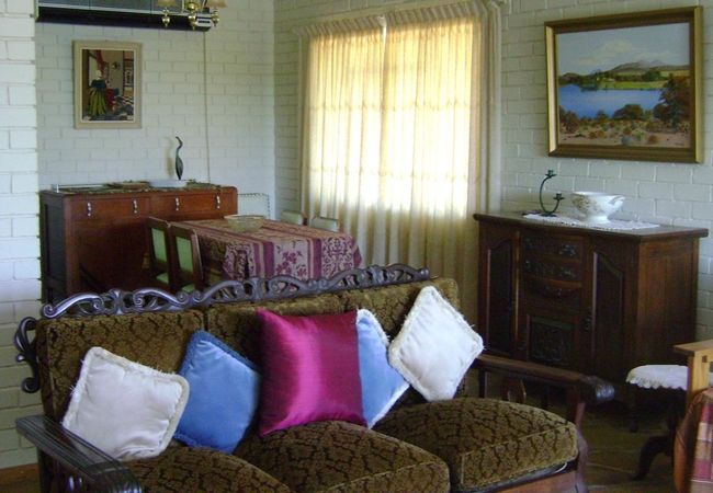 The 5-sleeper cottage can accommodate up to a maximum of 3 adults and 2 children under 12-years old. Two bedroom self-catering units. One room with double bed and one room with twins and there is a sleeper couch for two in the lounge. The kitchen is fully equipped and the patio has a braai area. We provide bedding but not towels. This unit has a inside fire place. All of the cottages have outside braai's and indoor fireplaces. The living areas open up onto shaded patios. This 6-sleeper cottage has use of a shared swimming pool.