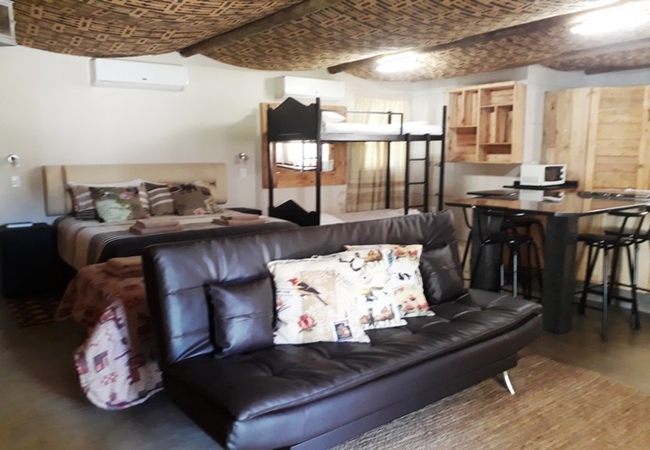 This open-plan flat with its rustic look can easily sleep eight people. It has a double bed, 2 three-quarter beds, double bunk beds and a double sleeper couch. The en-suite bathroom has a shower, toilet and wash basin. The kitchenette has a microwave, fridge, kettle, toaster and cutlery for eight guests. It also has lots of cupboards. A welcome gift of tea/coffee, milk, biscuits and bottled water is supplied.