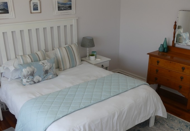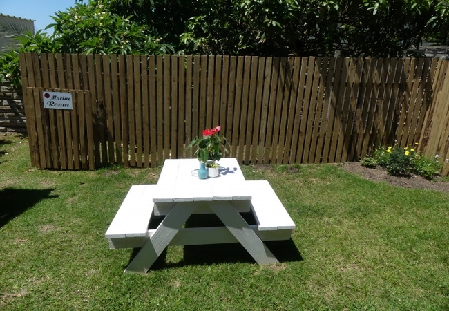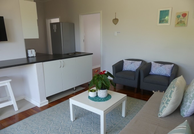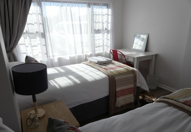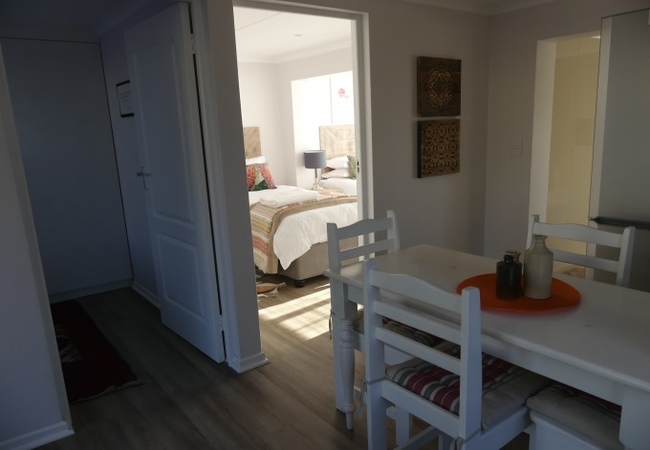 Marine Room: This unit sleeps four to six guests in two separate bedrooms. The main room has a Queen-size bed and the second room has two single beds. There is also a sleeper couch in the lounge. There is one bathroom just off the main bedroom with a shower. All linen and towels (except beach towels) are provided. In the open plan lounge area there is a TV equipped with DSTV (Hotel Package) Mnet and all Supersport. The kitchen is fully self-catering with breakfast nook and chairs and is equipped with a full range of crockery, cutlery and glassware as well as a stove, oven and standard fridge freezer. There is secure parking for one vehicle.