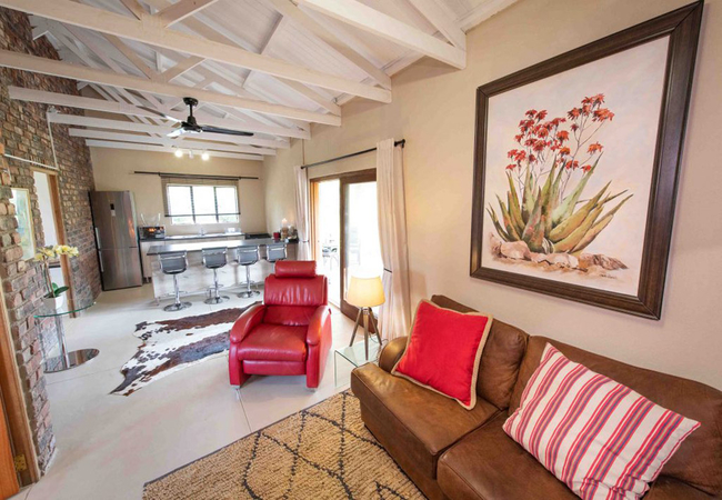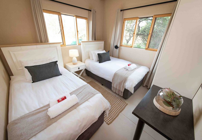 Each of our beautifully decorated chalets sleeps four guests and consists of two bedrooms and a separate bathroom with a shower, bath, toilet and a basin. Our open-plan kitchen is well equipped with quality appliances and kitchenware. There is also a cosy lounge. If you need to take a break from cooking, enjoy your Weber braai on the veranda. If you long for a bush fire, have a break around our fire pit in the communal area. At Route 40 you can relax and get away from the hustle and bustle of town. With only four chalets, guests are welcome to book the whole camp with friends and family.