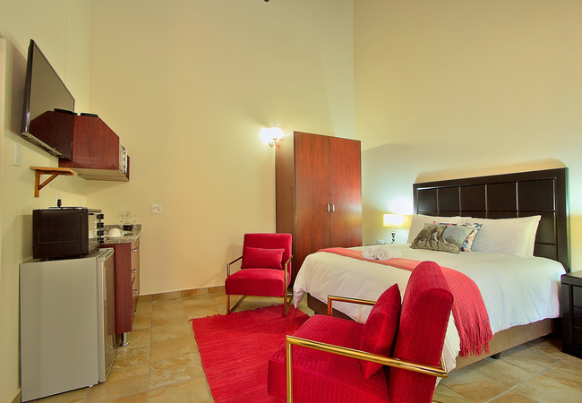 The luxury rooms are cosy and comfortable sleeping two adults in a Queen-size bed. Each room has a kitchenette, sitting area, TV and DSTV channels, private patio with braai area. The rooms offers tea/coffee making facilities, air-conditioning, bar fridge, microwave and conventional oven.