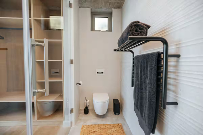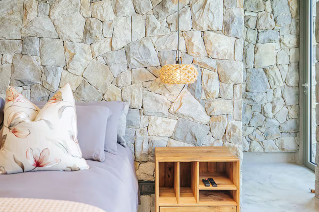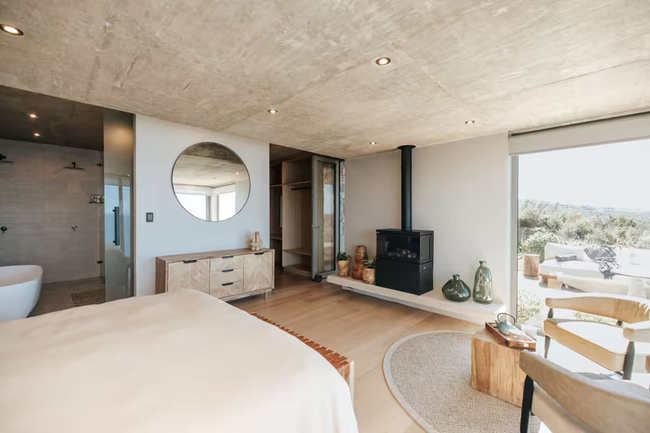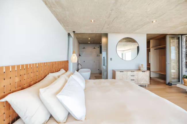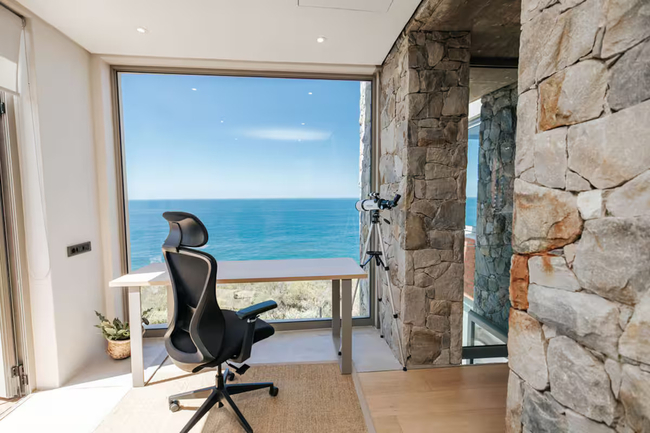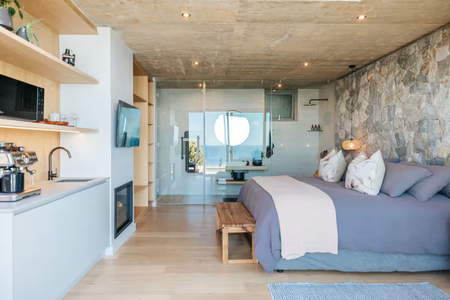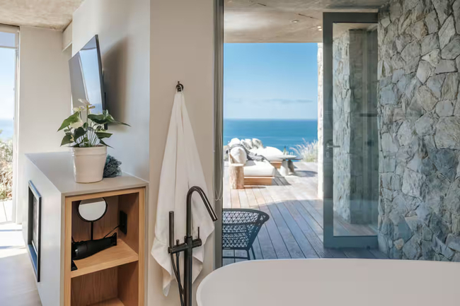 This exquisite residence boasts three bedrooms, each furnished with king-size beds, fireplaces, and en-suite bathrooms. The sliding doors in each room open onto either the balcony or the pool deck, featuring outdoor seating that perfectly frames the stunning sea views.