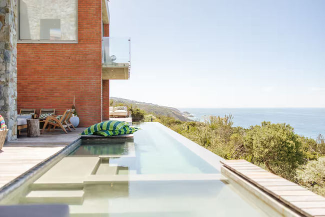 RRoar George stands as a testament to modern architecture, offering a unique design paired with sweeping 210 degree ocean vistas. Nestled within the secure confines of the Monate Eco Estate, this home is surrounded by pristine fynbos and a vibrant array of birdlife, making it an ideal spot for dolphin and whale watching.