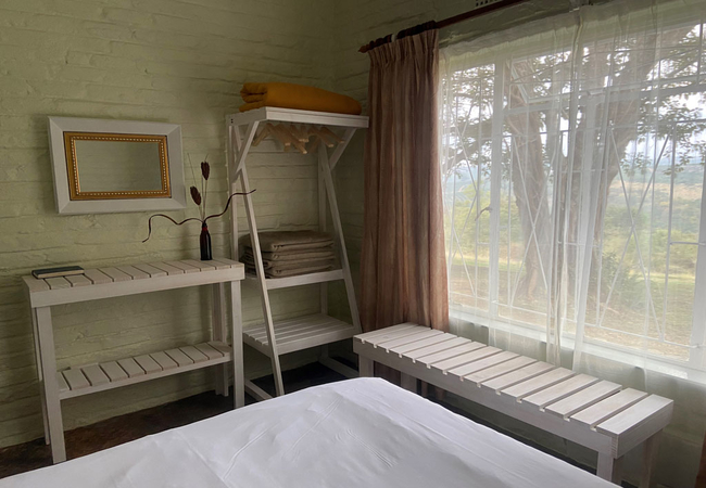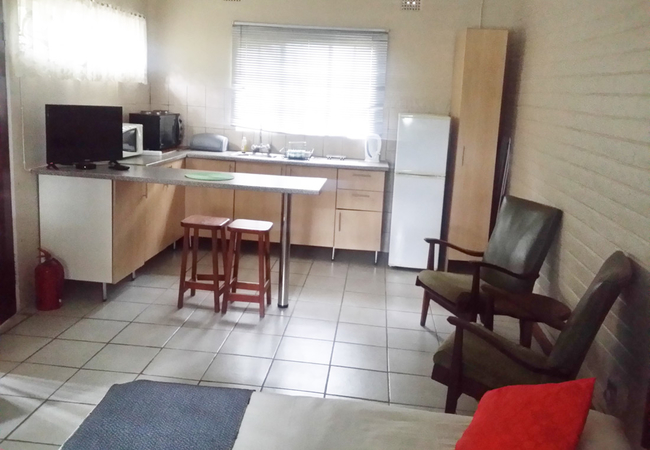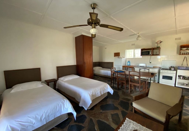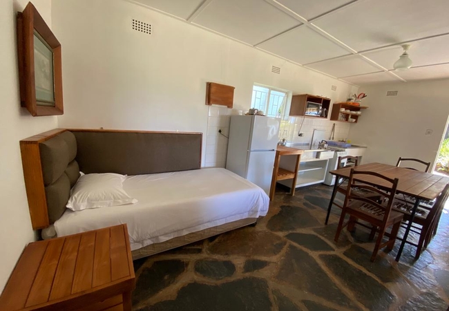 This unit is open-plan with a double bed, and a well-equipped kitchenette. There is a bathroom with a shower over the bath, a braai area and parking. Please bring your own towels and cleaning products. Sevice on request at an additional fee per day. Features: Double bed, Shower over bath, beautiful views, self catering, fan.