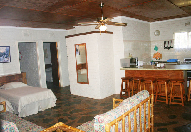 These units have two bedrooms with a double and single bed in each bedroom, as well as two single beds in the living area equipped for six adults and 2 children under 12 (or 4 adults + 4 kids). There is a single bathroom with a shower over the bath and a wash basin, a separate toilet, an open-plan living area with a well-equipped kitchenette, a braai area and parking next to the chalet. Please bring your own towels and cleaning products. Service on request at an additional fee. Features: Double + single beds, Shower over bath, Self-catering, Separate toilet, Fan