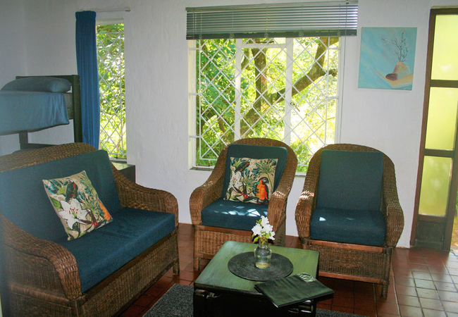 The 4-Sleeper Standard Family Chalet has a bedroom with a double bed, an open-plan living area with a set of bunk beds and equipped kitchenette, private bathroom with a separate toilet. Ideal for a family comprising two adults and two children. Private braai area and fire-pit on the banks of the river with free fire wood supplied daily.