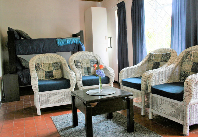 The 6-Sleeper Executive Chalet accommodates four adults and two children in two bedrooms. The master bedroom has a double bed and the second bedroom has two single beds which can be converted to a queen. There is also a set of bunk beds in the lounge area suitable for children. The kitchen is fully equipped with a breakfast bar and 4 plate hob stove. Bath Towels, bathroom amenities, complimentary tea and coffee, quality linens, hairdryer supplied. Private fire pit and braai area with free fire wood supplied daily. Tastefully decorated lounge with flat screen TV and DStv hospitality bouquet.