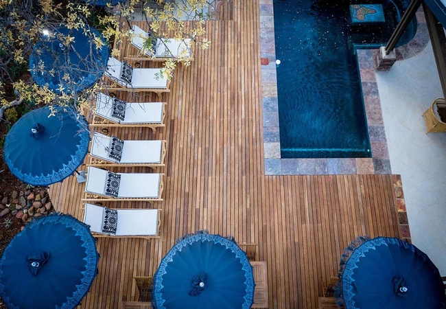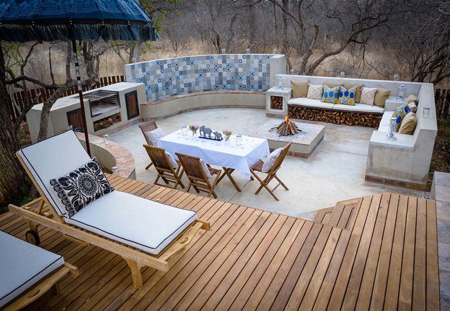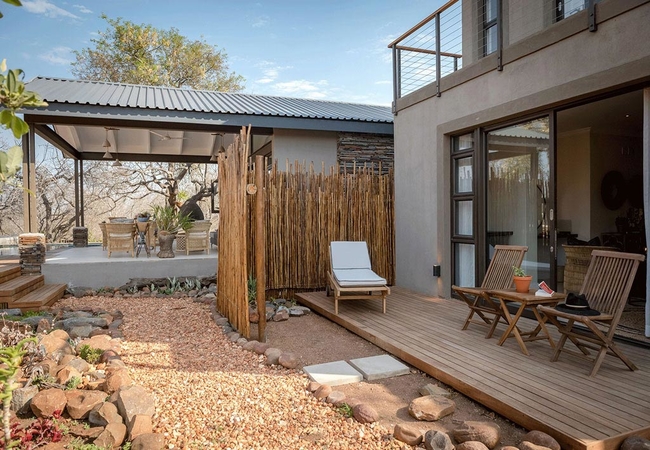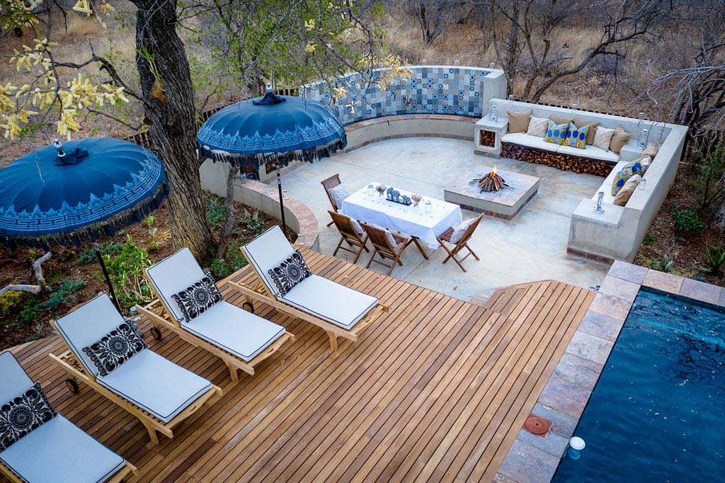 The main lodge opens out to a stylish outside lounge area, pool deck, sun loungers, succulent gardens, braai area and cosy boma. Water-features are found throughout the gardens and create a tranquil atmosphere. Beautiful Balinese parasols catch the bush-veld breeze and create an inviting appeal to the Safari Moon pool deck which is also shaded by a flowing Knobthorn, little Marula and a twisted Velvet Corkwood.