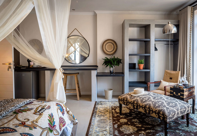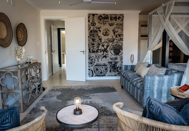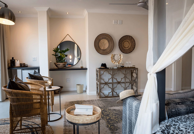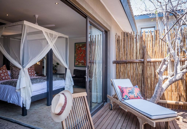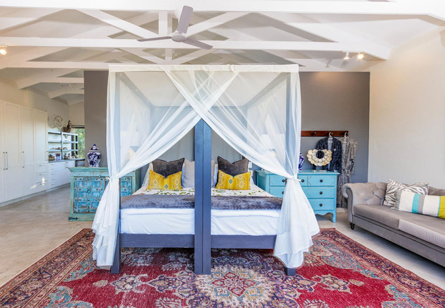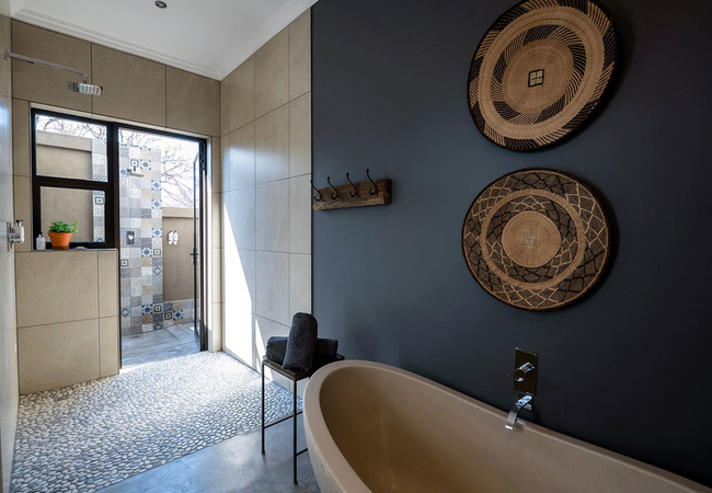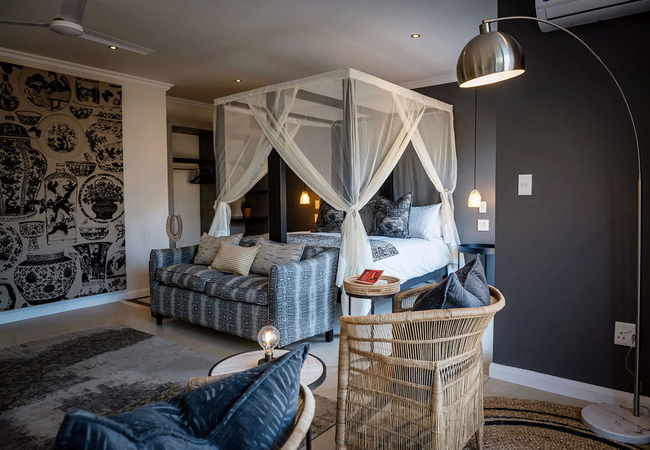 Named after the prickly porcupines that are often seen from the deck after dark, this room in on ground level and is one of the most spacious at 85 SQM in size and the most secluded of all the suites. The suite is furnished with a King-size extra length bed and an en-suite bathroom with a free-standing stone bath, toilet, basin and both a spacious indoor / outdoor rain shower. The suite is equipped with a bar fridge which can be stocked in advance on request, Wi-Fi and air conditioning. The outside seating area nestles in nature and is particularly perfect for romantic sundowners. Indoors there are more lounge areas to sit back and enjoy the eclectic artwork which adorns this room. Porcupine is for the wilder at heart.