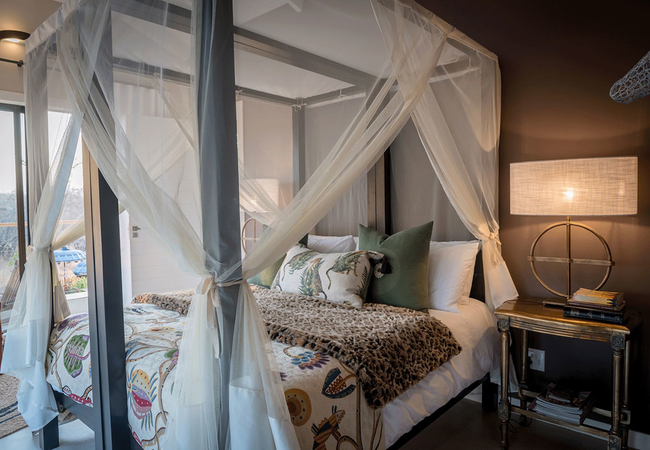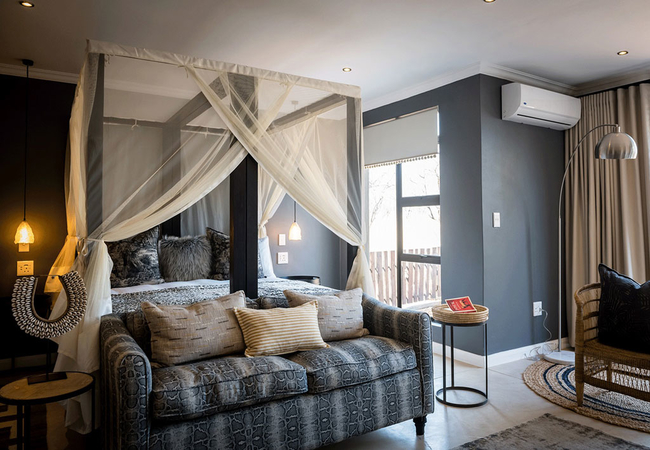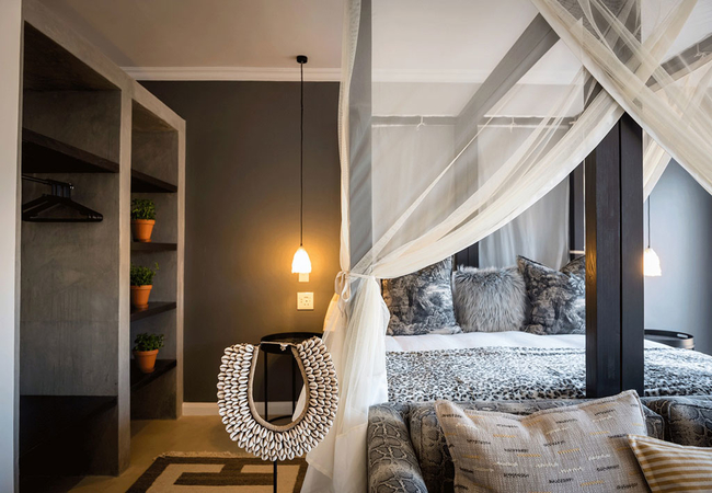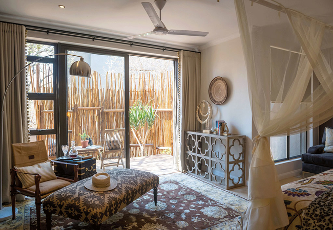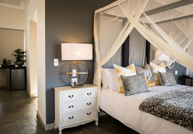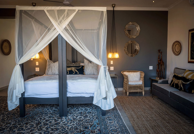 Aptly named after the busy bush babies which can be seen bounding about outside, this room is located in the lodge, up a short staircase from the main grand entrance. The highlight of this room are the sunset views from the elevated outside balcony which overlooks the main lodge, pool and surrounding bush. The suite is furnished with a King-size extra length bed and an en-suite bathroom with a stylish freestanding tub, walk in rain shower, toilet and double basin. The suite is equipped with a bar fridge which can be stocked in advance on request, Wi-Fi and air conditioning. Melvin and Moon chairs padded with Lo-Ki beetle cushions create a cosy corner perfect for an afternoon of reading or simply relaxing. Exquisite gold-side tables and elegant lamps sit beside the four posted bed and wildlife themed finishes can be found all over this room, from the animal artwork, to the ostrich egg detailed pillows. Bush Baby is ideal for the discerning traveller.