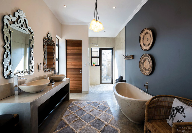Glamorous is the word that best describes this room which can be found elevated above the bush-veld and enjoys excellent views from the private deck. The suite is furnished with a King-size extra length bed. A large Moroccan inspired outdoor shower also is a main feature in this suite overlooking the majestic Drakensberg Mountains range. Inside, a beautiful blue-hued Persian, bejewels the floor beneath your feet and beaded cluster chandelier bring light and elegance to the bathroom which boasts a freestanding stone bath, double vanity basin, walk-in shower and toilet. The suite is equipped with a bar fridge which can be stocked in advance on request, Wi-Fi and air conditioning. Leopard is the room for the romantics.