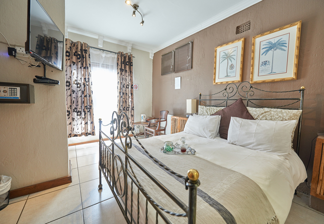 Ideal for couples, the room is furnished with a queen-size bed or or double bed, depends on rooms. The en-suite bathroom is fitted with a bath, shower over bath, toilet and basin. The room is equipped with a TV with DSTV, heating and electric blanket for heating. Wi-Fi available. Hearty home cooked breakfast included. Leads out to central garden.