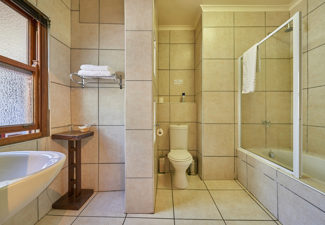Spacious and ideal for space seekers or those wanting a romantic getaway. Rest on a king size bed and in comfort. The en-suite bathroom is fitted with a separate bath and shower, toilet and basin. the room is equipped with a TV with DSTV, heating and electric blanket heating. Wi-Fi is available.