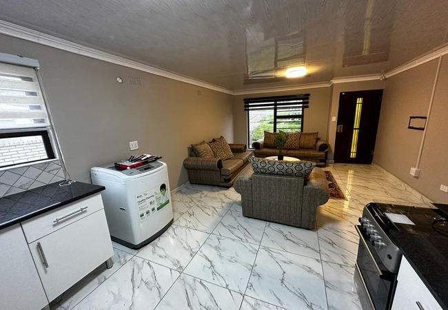 The living area is open plan and comprised of a comfortably furnished lounge which is equipped with a smart TV, Wi-Fi, a dining area furnished with a six seater table and a spacious kitchen which includes a bar fridge, two plate stove and oven, microwave, kettle, and toaster. There is also a washing machine and ironing facilities.